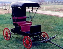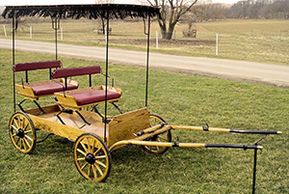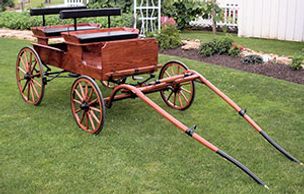 This is a nice little buggy to ride around in the parade or to go for a Sunday drive, the top folds down for transporting or for storage. A more economical version can be made without the top and or natural finished. Box size 29"x50" weight 275lbs This model is made for a pair of minis 30"-40" Or for a single pony 40"-48" $4260.00