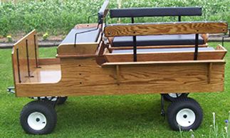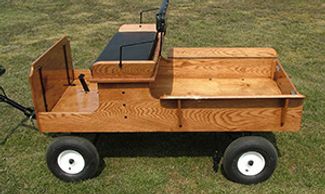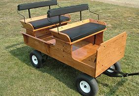 This compact mini wagon is great for pleasure driving or hauling things around the farm. The back seat is easily removable for hauling hay, firewood, ect. Standard features include brake system, heavy duty wheels, black vinyl seats, drop down tailgate, and choice of stain colors. You have a choice of metal shafts, wood shafts, or team pole. Bed size: 30"x5'. Weight: 188lbs